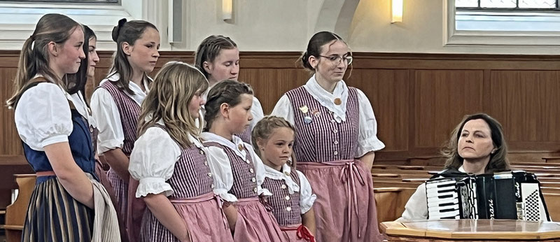(Das Chörli bei seinem Auftritt am FJVZ-Treffen 2025 in Horgen mit Dirigentin Brigitte Janser re.)